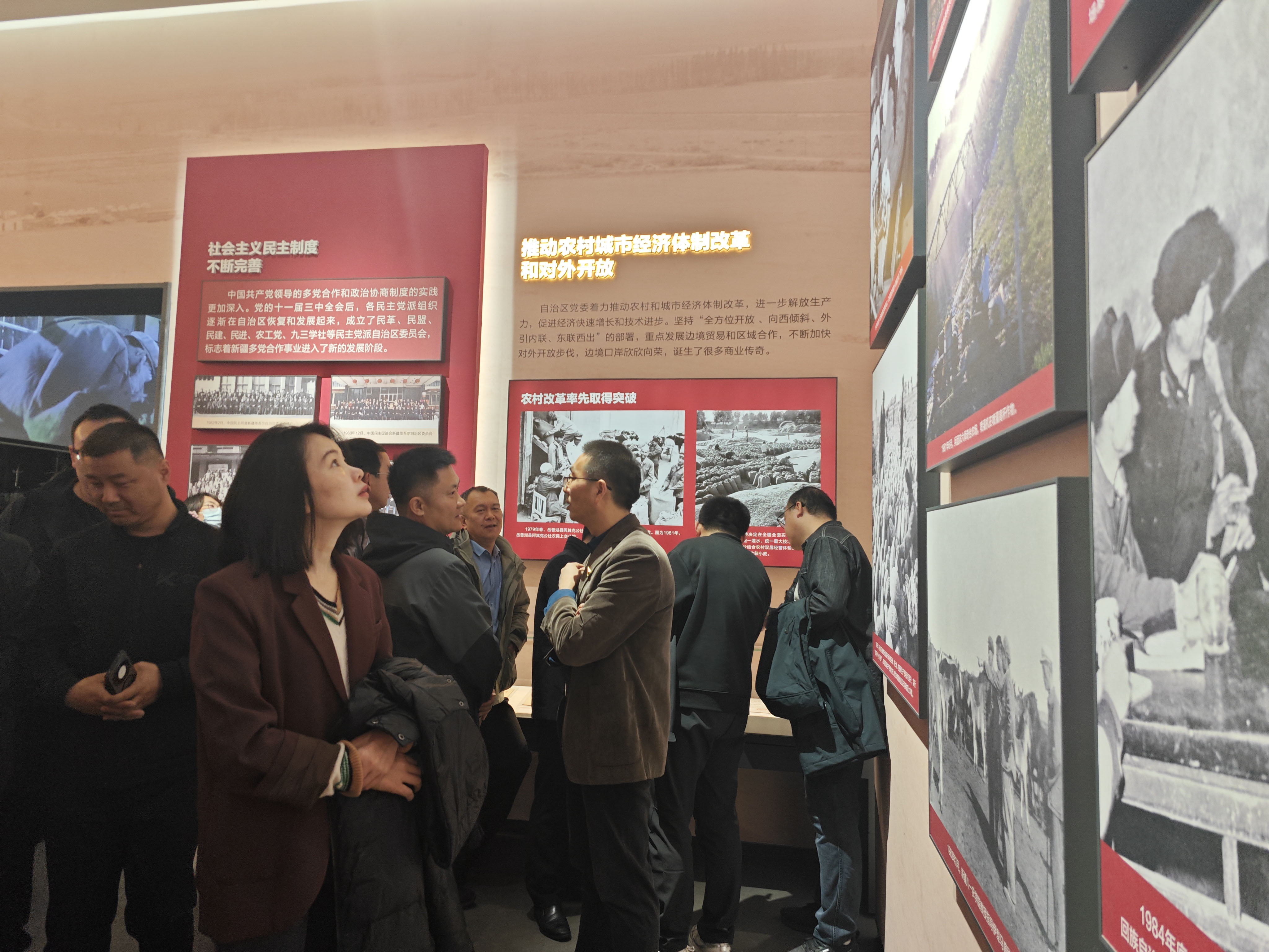 全体党员干部在讲解员引导和介绍下,依次参观了“万方乐奏换新天”“潮涌天山展宏图”“美丽新疆铸辉煌”三大篇章,通过1600余幅图片、1400余件实物模型及150多个多媒体视频,全景感受了新疆维吾尔自治区成立70年来在中国共产党的坚强领导下、在全国各地大力支援下,新疆各族人民团结一心、接续奋斗,在经济发展、民生改善、生态保护、民族团结等领域取得的辉煌成就。
