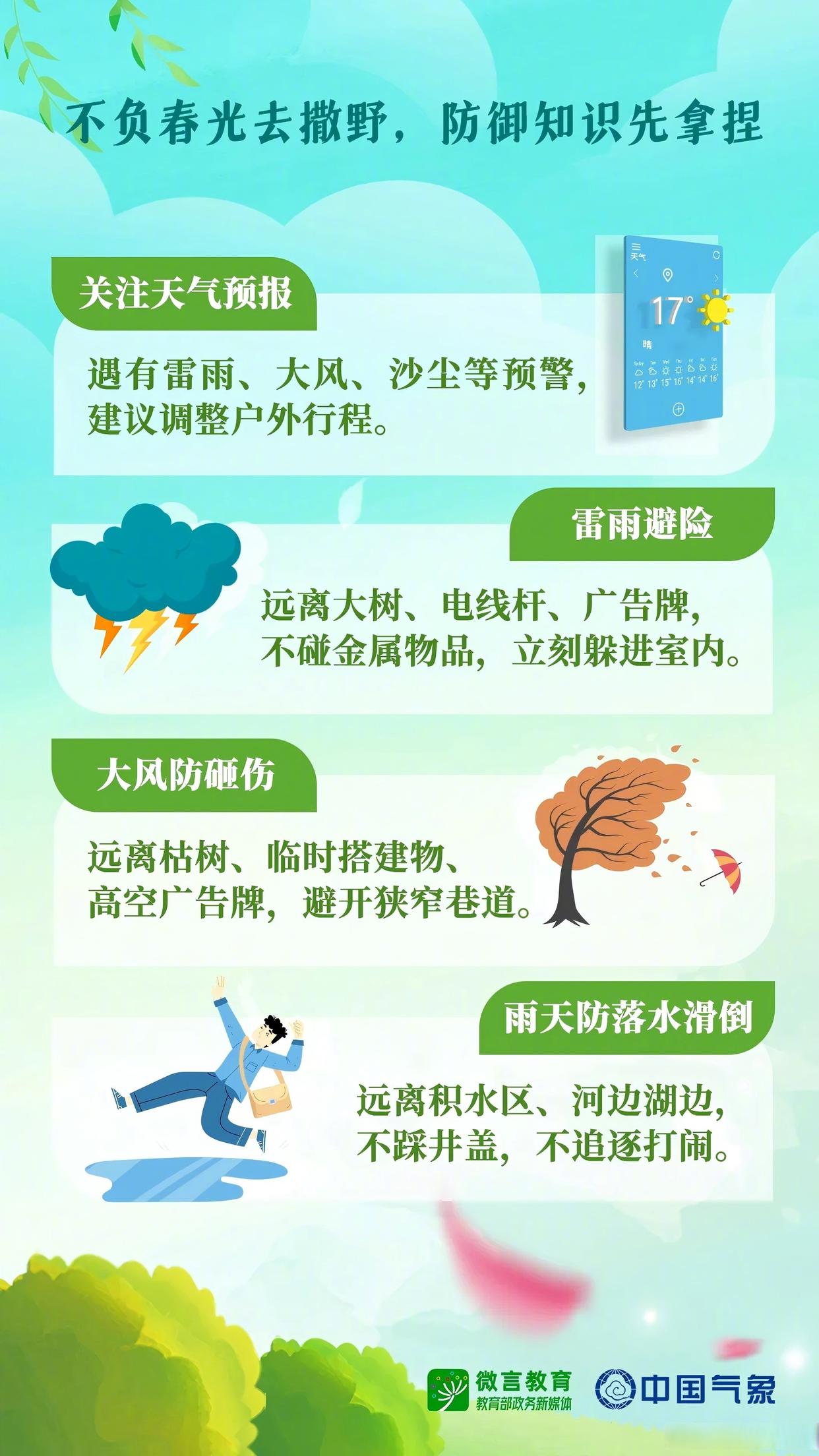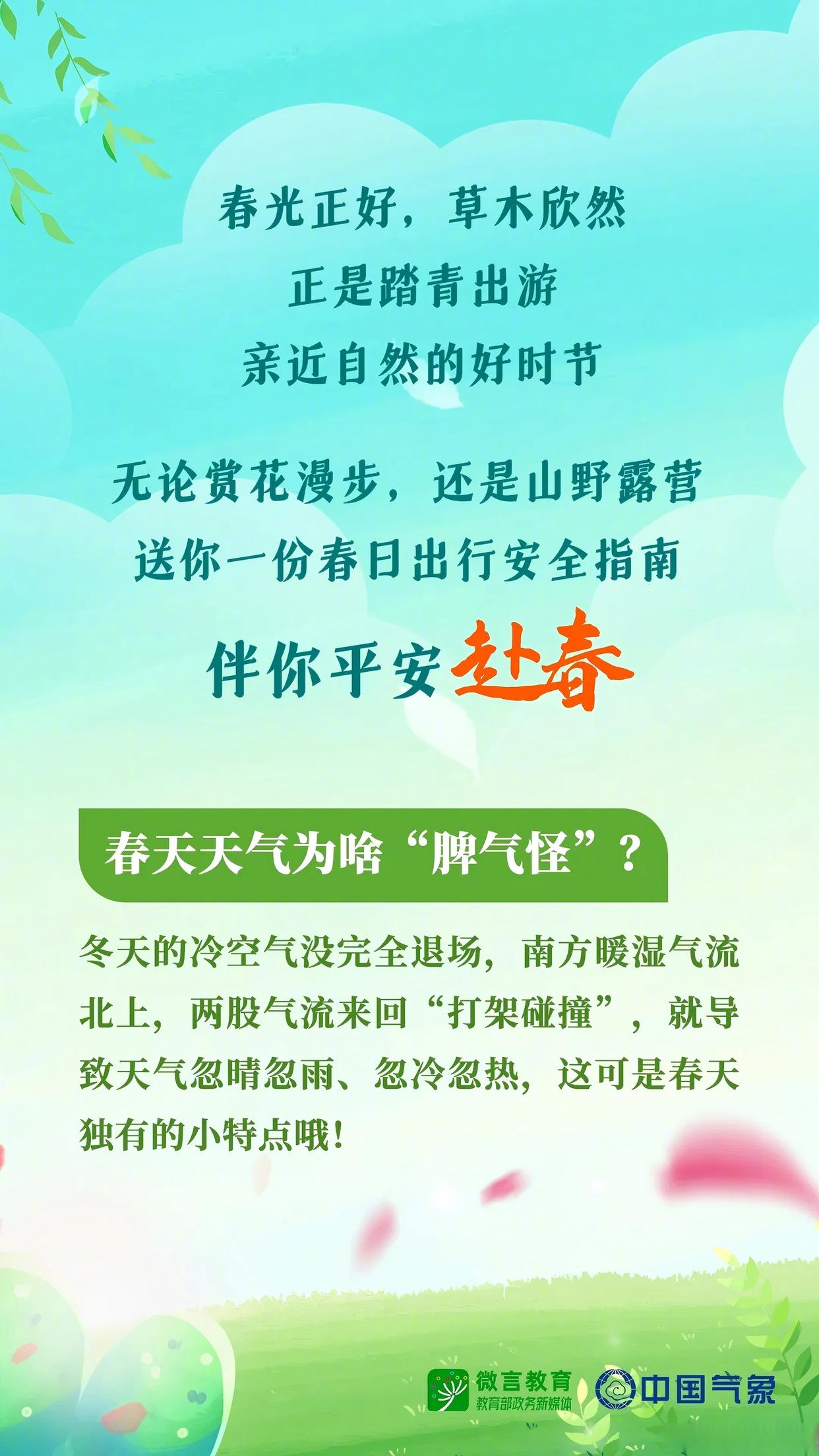 春光正好,草木欣然,正是踏青出游、亲近自然的好时节。 微言教育 联合 中国气象局 推出春日安全知识,从天气应对、穿衣技巧到防蚊防虫、森林防火。一起来看,伴你平安“赴春”——